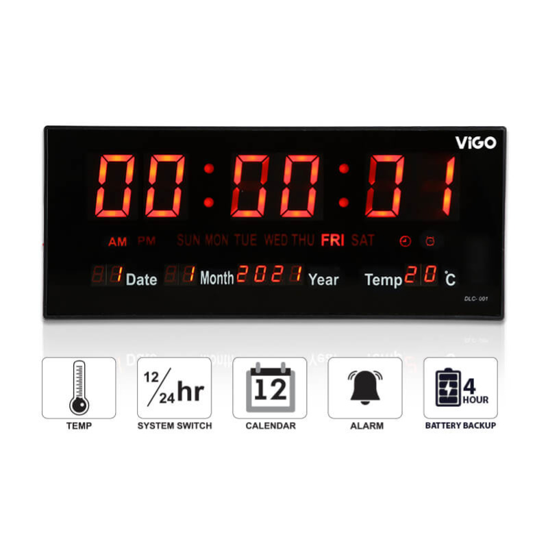 · Wall or Desktop Clock · Calendar , Alarm and Temperature Function · Two Way Charging Option · 4 hours Battery Backup · 12/24 Hour Display System · Quality Charge Controller · 3.7 V Lithium Polymer Battery with 50,000 Life Time